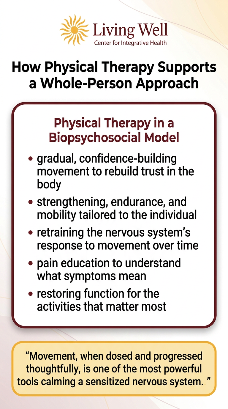 Understanding pain changes pain. When patients learn that movement is safe — and that pain does not always signal damage — fear tends to decrease, confidence tends to increase, and recovery becomes possible. Pain neuroscience education is not a soft add-on; it is a clinically supported component of effective chronic pain care.